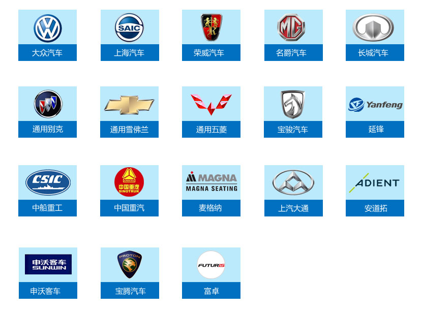 主要客戶有上海大眾汽車、上海通用汽車、上海汽車集團(tuán)、長(zhǎng)城汽車集團(tuán)、重慶力帆、安道拓座椅,富卓汽車內(nèi)飾等