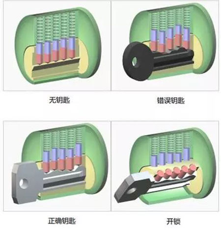 The principle is quite straightforward. The lock in the diagram consists of five pairs of pins (five upper pins and five lower pins) that can slide up and down within corresponding pin holes. When the correct key is inserted, the five upper pins retract into the lock body, aligning perfectly with the shear line between the plug and the lock body. At this point, the key can rotate the plug to unlock it. If the key does not match, the pins will remain stuck at the shear line, preventing the lock from opening.
